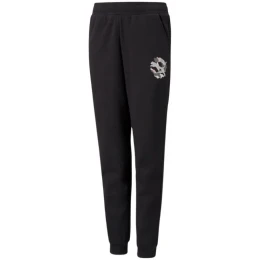 Detské tepláky značky Puma sú definíciou pohodlia. Model v minimalistickom štýle má mäkkú konštrukciu s vysokým obsahom bavlny, ktorá nedráždi a zabezpečuje prirodzenú ventiláciu tela. Prídavok polyesterových vlákien zvyšuje odolnosť. Elastický pás nastaviteľný pomocou šnúrky. Bočné vrecká na drobnosti. Rebrovanie v spodnej časti nohavíc. Model v čiernej farbe so zaujímavou grafikou na nohavici.