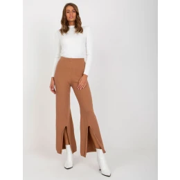 Úpletové nohavice s ťavou farbou, širokými nohavicami a rozparkom.