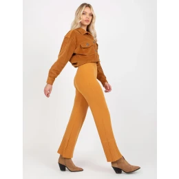 Tmavožlté široké pletené nohavice s vysokým pásom.