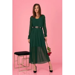 Dlhé šifónové šaty na dvojitom tyle v krásnom tmavo zelenom odtieni. Ideálne na sviatky aj mimo nich. Je vyrobené z elastických látok, takže je mäkké a ľahko sa prispôsobí telu. Hladký prekrývajúci sa predný diel, dlhé elegantné rukávy. Vzdušný, neuveriteľne ženský štýl. Ps. vrátane pásu.