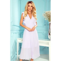 Plisované šifónové šaty s výstrihom a volánikmi. Sukňa má módnu dĺžku 7/8 a zapína sa vzadu na krytý zips. Šaty vo vresovo zelenej farbe. Vyrobené spoločnosťou numoco. Poľská produkcia.