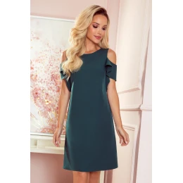 Trapézové šaty s volánikmi na rukávoch a podšívke. Vyrobené z tkaniny príjemnej na dotyk (95% polyester, 5% elastan). Šaty vo fľaškovo zelenej farbe. Značka Numoco. Poľská produkcia.