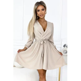 Ženské a elegantné šaty s obálkovým výstrihom, viazaním v páse a elastickými rukávmi. Šaty v béžovej farbe. Poľská výroba. Značka numoco.