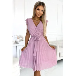 Šifónové šaty s výstrihom a volánmi na ramenách. Šaty v špinavoružovej farbe. Značka numoco. Poľská výroba.