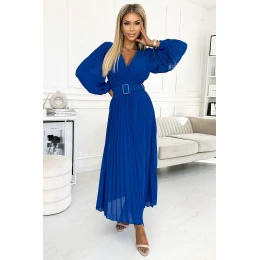 Plisované šifónové šaty s výstrihom, dlhými rukávmi a opaskom. Plisovanie na výstrihu a rukávoch dodáva šatám eleganciu. Šaty sú v chrpovej farbe. Značka numoco.