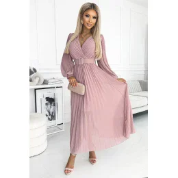 Plisované šifónové šaty s výstrihom, dlhými rukávmi a opaskom. Plisovanie na výstrihu a rukávoch dodáva šatám eleganciu. Šaty v púdrovo ružovej farbe. Značka numoco.