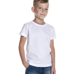 Dziecięcy t-shirt z krótkim rękawem wykonany z wysokiej jakości dzianiny typu single jersey, zapewniającej komfort noszenia oraz doskonałą przewiewność. Klasyczny fason sprawia, że koszulka idealnie sprawdzi się zarówno na co dzień, jak i podczas aktywności w szkole czy na placu zabaw. Materiał został poddany praniu enzymatycznemu, dzięki czemu powierzchnia tkaniny jest gładka i pozbawiona nierówności. Dodatkowe wykończenie silikonowe sprawia, że koszulka jest wyjątkowo miękka i przyjemna w dotyku. Dekolt został wykończony dwuwarstwowym ściągaczem z dodatkiem elastanu, co zwiększa trwałość i pozwala zachować kształt nawet po wielu praniach. Kark oraz ramiona zostały wzmocnione kontrastową taśmą stabilizującą, która zwiększa wytrzymałość szwów. Koszulka posiada boczne szwy oraz podwójne, gęste przeszycia wykonane wysokiej jakości nićmi, co zapewnia jej trwałość oraz estetyczny wygląd przez długi czas.