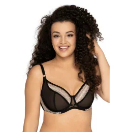Model spája svetlo béžovú čipku s hlbokou čiernou farbou. Ramienka nie je možné odopnúť, je možné ich nastaviť (kovový antialergický regulátor), šírka prispôsobená veľkosti a rozmeru. Zapínanie na dvojradové háčiky s tromi stupňami nastavenia. Podprsenka nemá bočné kostice.Zloženie: 88% polyamid, 8% bavlna, 4% elastan.