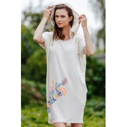 Letné šaty z mäkkého, vzdušného viskózového úpletu. Jedinečný melír s vpletenými zlatými niťami. Podrobná ľudová kresba kvetinových motívov z krakovskej oblasti.