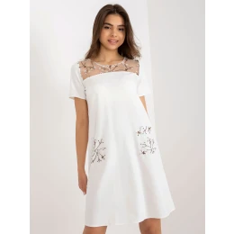 Koktailové šaty v ecru farbe s krátkymi rukávmi.