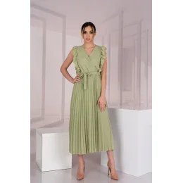 Štýlové plisované šaty s opaskom v páse, vrstveným výstrihom, vďaka ktorému sa budete cítiť zmyselne a krásne. Rukávy v podobe jemných volánov. Dlhšia verzia, krásne prezentovaná. Zloženie: 95 % polyester, 5 % elastan.