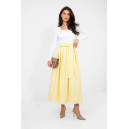 Táto elegantná midi sukňa s rozšíreným strihom je skvelou voľbou pre ženy, ktoré ocenia klasiku s nádychom modernosti. Model s vysokým pásom krásne zvýrazňuje pás a elastický pás zaručuje ideálne prispôsobenie a pohodlie počas celého dňa. Sukňa je vyrobená z pruhovaného materiálu, ktorý jej dodáva štýlový charakter a opticky zužuje postavu. Jej súčasťou je všitý opasok na zaväzovanie, ktorý ešte viac zvýrazňuje pás a dodáva stylingu individuálny výraz. Praktické vrecká zvyšujú funkčnosť modelu. Sukňa je vyrobená z kombinácie polyesteru, viskózy a elastanu a spája odolnosť s jemnosťou a pružnosťou, čo zaručuje pohodlie a elegantný vzhľad v kancelárskom stylingu aj na špeciálne príležitosti.