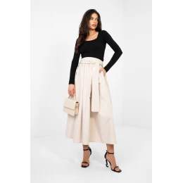 Táto elegantná midi sukňa s rozšíreným strihom je skvelou voľbou pre ženy, ktoré ocenia klasiku s nádychom modernosti. Model s vysokým pásom krásne zvýrazňuje pás, zatiaľ čo elastický pás zaručuje ideálne prispôsobenie a pohodlie počas celého dňa. Sukňa je vyrobená z pruhovanej tkaniny, ktorá jej dodáva štýlový charakter a opticky zužuje postavu. Jej súčasťou je všitý pás na zaväzovanie, ktorý ešte viac zvýrazňuje pás a dodáva stylingu individuálny výraz. Praktické vrecká zvyšujú funkčnosť modelu. Sukňa je vyrobená z kombinácie polyesteru, viskózy a elastanu a spája odolnosť s jemnosťou a pružnosťou, čo zaručuje pohodlie a eleganciu pri kancelárskom stylingu aj špeciálnych príležitostiach.