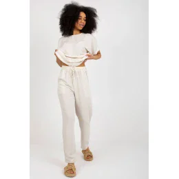 Letná súprava pozostávajúca z blúzky a nohavíc. Blúzka s krátkymi rukávmi a okrúhlym výstrihom. Dlhé nohavice so zaväzovaním v páse a vreckami.