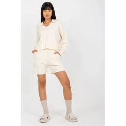 Ležérna súprava pozostávajúca zo šortiek a svetra. Voľný sveter s dlhými rukávmi. Krátke šortky s elastickým pásom a vreckami.