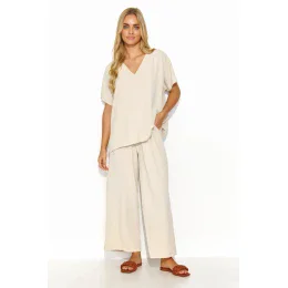 Tato klasická dámská souprava z lehké a vzdušné tkaniny je kombinací městské elegance a nonšalantního pohodlí. Tento praktický komplet se skládá ze vzdušné a stylové halenky a kalhot s pohodlnými širokými nohavicemi. Dámská halenka má výstřih ve tvaru písmene V, díky němuž jsou šperky, které se k ní hodí, velmi dobře viditelné a vystavené. Zlaté třpytky na rukávech navíc dodávají jemný dekorativní nádech. Souprava je k dispozici ve čtyřech velmi módních a elegantních barevných variantách, jako je khaki, světle béžová, černá a cappuccino. Oděv je velmi příjemný a příjemný na dotek a je ideální pro velké výlety i nedělní procházky s rodinou a přáteli. Stylově se hodí také do práce nebo na důležitou obchodní schůzku.