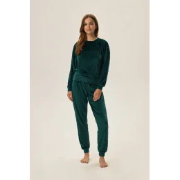 Pohodlie, voľnosť a móda, tieto tri slová dokonale vystihujú zamatový džersejový set značky Fain. Ide o dámsky set pozostávajúci z mikiny a dlhých nohavíc. Set je vyrobený z príjemnej zamatovej sieťoviny v módnom tmavozelenom odtieni. Pre lepšie prispôsobenie je v páse neprekrížiteľná guma a rukávy a nohavice sú zakončené elastickými lemami. Zloženie: Vrchná časť: 95% polyester, 5% elastan Spodná časť: 95% polyester, 5% elastan