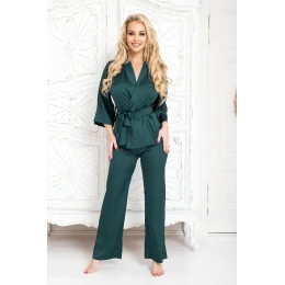 Dvojdielna súprava vyrobená z kvalitnej, jemnej saténovej tkaniny pripomínajúcej hodváb. Kimonový strih blúzky s opaskom na zvýraznenie pása. Dlhé rovné nohavice so širšími manžetami dodávajú eleganciu. Súprava Perai je elegantný dizajn pyžama, ktorý sa hodí aj do tých najnáročnejších interiérov. Vďaka tejto súprave sa budete cítiť zmyselne, elegantne a žensky. Kartónové balenie, ktoré obsahuje pyžamo, je ideálne ako darček.