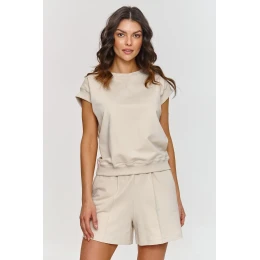Tento teplákový set je kombinací pohodlí a módního vzhledu, ideální na letní dny a aktivity venku. Triko s volným střihem zakončené manžetami získává na pružnosti a univerzalitě. Raglánové rukávy opticky zúží horní linii ramen a poskytnou široký rozsah pohybu. Krátké kraťasy mají elastický pas, který zajistí pohodlné přizpůsobení a volný střih neomezuje pohyby. Kapsy po stranách jsou praktickým doplňkem, který zvyšuje funkčnost. Lem na kraťasech jim dodává sofistikovanější charakter a zároveň přidává outfitu trochu formálnější výraz. Tento detail je činí elegantnějšími, ideálními jak na každodenní nošení, tak i na trochu formálnější příležitosti. Navíc takový steh na nohavicích opticky prodlužuje nohy a zajišťuje, že kraťasy mají elegantnější tvar, což je výhodné pro postavu. Teplákový set spojuje decentní eleganci se stylovým designem a zároveň zajišťuje maximální pohodlí a nadčasový charakter.