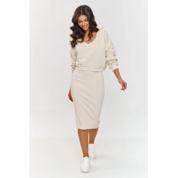 Táto tepláková súprava je ponukou pre ženy, ktoré oceňujú štýl s nádychom pohodlia. Jednoduchý strih a univerzálny tvar šiat dokonale zvýrazňuje postavu. Vďaka elastickej štruktúre materiálu sú elastické a zároveň kompaktné, čo poskytuje úplnú voľnosť pohybu. Midi dĺžka je módnou klasikou, ktorá zároveň zdôrazňuje eleganciu a nikdy nevyjde z módy. Voľný strih teplákovej súpravy a výstrih do V jej dodávajú voľný, ale štýlový charakter. Rukávy ukončené elastickými manžetami umožňujú upraviť ich dĺžku a krátky strih je ideálny pre šaty, ktorým dodáva ľahkosť. Voľná tepláková súprava a priliehavé šaty vytvárajú módny, ale praktický vzhľad, ktorý je vhodný na každodenné stretnutia, ako aj na oddychové dni doma.