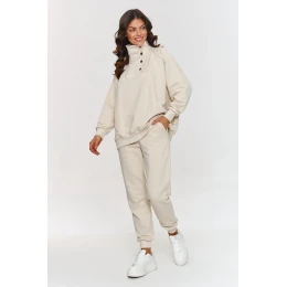 Jednoduchý a zároveň velmi stylový komplet s mikinou s knoflíky je skvělou volbou pro milovnice minimalismu a pohodlí. Bez kapuce, ale s maximálním pohodlím, mikina s volným střihem a jemnými knoflíky dělá tento set mimořádně univerzálním a hodí se na mnoho příležitostí. Teplákové kalhoty mají volný střih a stahovací šňůrky u nohavic, které zajistí dokonalé přizpůsobení a pohodlí po celý den. Elastický pas zajišťuje, že kalhoty jsou pohodlné a neomezují pohyb. Volná mikina má klasický střih bez kapuce, což umožňuje skvěle padnout pod kabát nebo bundu. Navíc má stojánek zdobený stylovým detailm v podobě kovových knoflíků. Díky přírodnímu materiálu je tento komplet skvělou volbou jak na volný den doma, rychlé nákupy, tak i setkání s přáteli nebo cyklistické výlety. Můžete ho nosit jako celek nebo kombinovat jednotlivé kusy s jiným oblečením, vytvářejíc mnoho módních setů. Investujte do pohodlí a nadčasového stylu, t