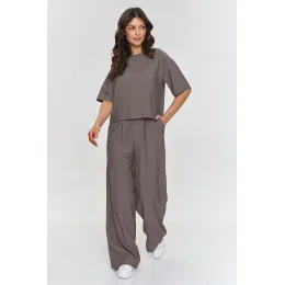 Tento elegantní set je ideální volbou na jarní a letní dny, kdy chcete spojit módní vzhled s vysokou kvalitou provedení. Sada obsahuje volnou blůzu s boxovým střihem, která skvěle ladí s elegantními styly. Krátký rukáv a jednoduchý střih blůzy z ní činí skvělou volbu jak pro formální, tak méně formální události, spojující eleganci s pohodlím. Kalhoty se vyznačují širokými nohavicemi, které outfitu dodávají moderní a elegantní vzhled. Elastický pás zajišťuje pohodlné nošení a jejich délka dodává celku třídu a styl. Model je vyroben z jemného a lehkého materiálu imitujícího len. Jednoduchý, ale vysoce sofistikovaný střih dává setu nadčasový charakter, který bude vypadat stylově na každé postavě. Sada se skvěle hodí na obchodní schůzky, elegantní události nebo výlety do města, kdy si chcete spojit eleganci a pohodlí. Můžete ji zkombinovat se štíhlými podpatky, elegantními sandály nebo bílými teniskami.