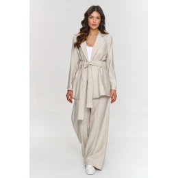 Tento dámský set byl navržen s ohledem na ženy, které hledají spojení stylu, pohodlí a moderní elegance. Sako s delším volným střihem dodává outfitu moderní charakter a pásek umožňuje přizpůsobení postavy a zdůraznění pasu. Nemá podšívku, což ho dělá lehčím a volnějším. Kalhoty s širokými nohavicemi zdůrazňují módní vzhled a elastický pás zajistí maximální pohodlí. Model je vyroben z lehkého strukturovaného materiálu, který zdůrazňuje jeho výjimečnost a třídu. Další výhodou je možnost nosit každý kus samostatně a vytvářet různé a originální outfity. Díky jednoduchému, ale efektnímu designu je tento set skvělým řešením jak pro večery s přáteli, tak do kanceláře, na obchodní schůzky a jiné formální události, kde chcete vypadat profesionálně a zároveň nechcete ustupovat pohodlí.