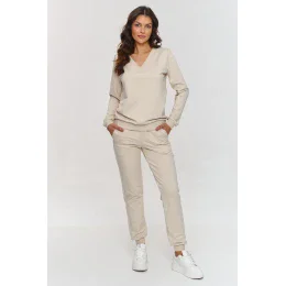 Dámská tepláková souprava, držící se jednoduché estetiky, se hodí téměř na každou příležitost. Souprava se skládá z mikiny nasazované přes hlavu a klasických a pohodlných kalhot. Mikina nemá kapuci, místo toho má výstřih do srdce lemovaný lemem a ukončený na zakázkový lem, co přidává kompletu nádech elegance. Lemování je také přítomné na rukávech a na spodní části mikiny, díky čemuž se skvěle přizpůsobuje postavě. Kalhoty jsou vyrobeny ze stejného materiálu, mají bokové kapsy a lemy umístěné v pasu a v dolní části nohavic. Tato souprava je skvělou volbou pro ženy, které si cení klasiky a nadčasovosti ve svém šatníku. K němu si vezměte designové tenisky nebo jednoduché tenisky, v každém případě se souprava bude prezentovat velmi stylově.