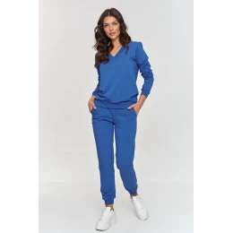 Dámsky komplet s úzkym estetickým strihom bude skvelou voľbou takmer na každú príležitosť. Komplet sa skladá z mikiny s kapucňou s nasadením cez hlavu a klasických a pohodlných nohavíc. Mikina nemá kapucňu, ale má výstrih do V lemovaný lemom a zakončený golierom, ktorý dodáva oblečeniu elegantný nádych. Lemovanie sa nachádza aj na rukávoch a v spodnej časti mikiny, vďaka čomu sa skvele prispôsobí postave. Nohavice sú vyrobené z rovnakého materiálu a majú bočné vrecká a lemy v páse a na spodnej časti nohavíc. Tento komplet je skvelou voľbou pre ženy, ktoré vo svojom šatníku ocenia klasiku a nadčasovosť. K oblečeniu si obujte značkové tenisky alebo jednoduché tenisky, v ktorých budete vyzerať veľmi štýlovo.