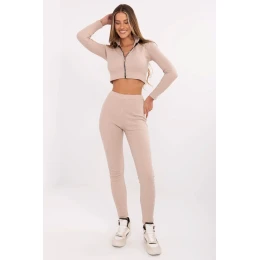 Casualový dámský set z pruhované látky je ideální volbou pro každodenní pohodlný styl. Součástí setu je krátká mikina s límcem, dlouhým rukávem a praktickým zipem, a kalhoty s dlouhými, sevřenými nohavicemi a vysokým pasem. Set je vyroben z měkké, elastické látky z kombinace bavlny a elastanu, která zajišťuje pohodlí a volnost pohybu. Hladký vzor a pruhovaná struktura látky dodávají celku moderní, minimalistický vzhled. Absence kapes zdůrazňuje sportovně-městský charakter setu a přizpůsobený střih zajišťuje, že set skvěle padne na postavu. Je to skvělá volba na každý den, ideální na procházku, nákupy nebo relaxaci v domácím útulku. Stylový, funkční a neuvěřitelně pohodlný.