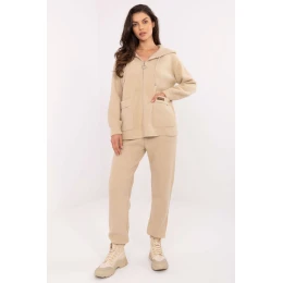 Tento volný dámský set je ideální nabídkou na chladnější dny, stylový, pohodlný a příjemně objímající. Vyrobený z vysoké kvality směsi vlny, viskózy, angory a polyesteru, poskytuje vynikající tepelný komfort, měkkost a odolnost. Mikina s zipem má praktickou kapuci, dlouhý rukáv a velké nášivky kapsy na přední straně, které dodávají charakter a funkčnost. Její jednoduchý, hladký vzor dokonale ladí s různými doplňky a hodí se jak doma, tak na procházku. Kalhoty s dlouhými, zužujícími se nohavicemi mají vysoký pas a šňůrku v pase, díky čemuž skvěle sedí na postavu. Boční, vsunuté kapsy přidávají praktičnost bez narušení minimalistické formy. Tento set je ideální pro každodenní aktivity, kombinuje volnost pohybu, teplo a stylový vzhled v jednom setu.