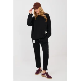 Dámský dresový set skládající se z mikiny a kalhot je ideální nabídkou pro každodenní outfit ve stylu casual, kombinující pohodlí s minimalistickým designem. Hladký střih činí set univerzálním a skvěle se hodí jak do domácího prostředí, tak i na vycházky do města nebo procházky. Set je vyroben z vysoce kvalitní směsi polyesteru, viskózy a elastanu. Materiál typu měkké máslo je nesmírně měkký, jemný a mimořádně příjemný na dotek, poskytující maximální pohodlí při nošení. Mikina s dlouhým rukávem a klasickým, kulatým výstřihem má decentní nášivku umístěnou dole vpředu na levé straně, která celku dodává moderní akcent. Kalhoty s dlouhou délkou a zužujícími se nohavicemi skvěle padnou na postavě. Vysoký pas a šňůrky k uvázání v pase umožňují ideální přizpůsobení, a boční kapsy zvyšují funkčnost setu.