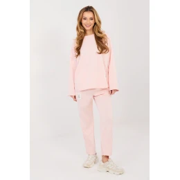 Dámský teplákový set skládající se z mikiny a kalhot je ideální volbou pro každodenní outfit v casual stylu, spojující pohodlí s minimalistickým designem. Hladký střih dělá set univerzálním a skvěle poslouží jak doma, tak při vycházkách do města nebo na procházkách. Set je vyroben z vysoce kvalitní směsi polyesteru, viskózy a elastanu. Materiál typu "masełko" je neuvěřitelně měkký, jemný a mimořádně příjemný na dotek, poskytující maximální pohodlí při nošení. Mikina s dlouhým rukávem a klasickým, kulatým výstřihem má decentní nášivku umístěnou dole vpředu na levé straně, která dodává celku moderní akcent. Kalhoty s dlouhou délkou a zužujícími se nohavicemi skvěle padnou na postavu. Vysoký pas a šňůrky k zapínání v pase umožňují ideální přizpůsobení, a boční, zasunuté kapsy zvyšují funkčnost setu.