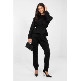 Elegantní dámský set skládající se z mikiny a kalhot, ideální na každodenní nošení a do práce v méně formálním provedení. Kombinovaný charakter setu spojuje pohodlí s moderním, minimalistickým designem. Model vyrobený z vysoké kvality směsi polyesteru, viskózy a elastanu, díky čemuž je materiál měkký, elastický a příjemný na nošení. Hladká tkanina zdůrazňuje univerzální styl setu a usnadňuje vytváření různorodých stylizací. Mikina s dlouhým rukávem a klasickým, kulatým výstřihem poskytuje pohodlí a nadčasový vzhled. Vykrojení v pasu jí dodává lehkost a decentně zdůrazňuje postavu. Kalhoty s vysokým pasem a elastickým pásem zaručují pohodlné přizpůsobení. Dlouhé nohavice s lemováním na suchý zip dodávají sportovní nádech, a boční kapsy zvyšují funkčnost. Jedná se o praktický a stylový set, který se osvědčí jak při každodenních povinnostech, tak v práci, zajišťujíc pohodlí po celý den. Materiál typu "máslo"