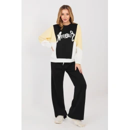 Mimořádně pohodlný dámský teplákový set vyrobený z materiálu typu "másla" je neuvěřitelně měkký, jemný a příjemný na dotek. Tkanina z polyesteru, viskózy a elastanu je elastická, lehce se chytá a skvěle padne na postavu, poskytujíc maximální pohodlí při každodenním nošení. Set se skládá z mikiny s dlouhým rukávem a kalhot s širokými, dlouhými nohavicemi. Mikina s klasickým, kulatým výstřihem je ozdobena efektním nápisem s flitry, který dodává celku módní a ženský charakter. Kalhoty s vysokým pasem krásně zdůrazňují pas a zajišťují pohodlné nošení. V pase jsou šňůrky na stažení, umožňující ideální přizpůsobení postavě. Praktické boční kapsy zvyšují funkčnost a široké nohavice dodávají stylizaci uvolněný, moderní vzhled. Jedná se o ideální set pro ženy, které oceňují spojení mimořádné měkkosti, pohodlí a módních detailů v každodenních outfitcích.