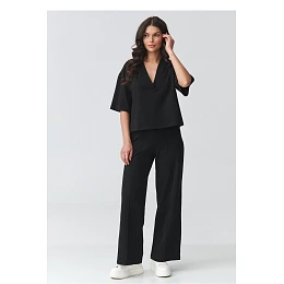Elegantní dámský set s širokými kalhotami je ideální kombinací pohodlí a moderní elegance. Sada se skládá z volného topu s výstřihem ve tvaru písmene V a kalhot s širokými nohavicemi, které krásně prodlužují postavu a dodávají stylizaci lehkost. Tento elegantní dámský set je vhodný jak na každý den, tak i na formální události. Je to skvělá volba do práce, na schůzku, procházku nebo výlet. Minimalistický střih umožňuje vytvářet různé stylizace, ve sportovní verzi s teniskami nebo elegančnější s elegantní obuví. Volný střih topu zajišťuje pohodlí nošení a decentně zdůrazňuje linii výstřihu, zatímco široké dámské kalhoty zaručují pohodlí a módní, nadčasový vzhled. Celkově vytváří ucelený volný dámský set, který spojuje pohodlí s elegancí.
