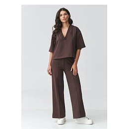 Elegantní dámský set s širokými kalhotami je ideální kombinací pohodlí a moderní elegance. Sestava se skládá z volného topu s V výstřihem a kalhot s širokými nohavicemi, které krásně prodlužují postavu a dodávají stylizaci lehkost. Tento elegantní dámský set je vhodný jak na každodenní nošení, tak i na formální události. Je to skvělá volba do práce, na schůzku, procházku nebo výlet. Minimalistický střih umožňuje vytvářet různé stylizace, buď ve sportovní verzi s teniskami, nebo elegančnější s elegantní obuví. Volný střih topu zajišťuje pohodlí při nošení a jemně zdůrazňuje linii dekoltu, zatímco kalhoty s širokou nohavicí zaručují pohodlí a módní, nadčasový vzhled. Celkově vytváří sestavu dámského casual setu, který spojuje pohodlí s elegancí.