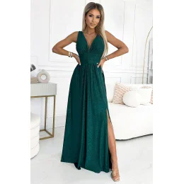 SUSAN - dlhé šaty s výstrihom, rozparkom na nohách a tromi stehmi v páse. vyrobené z elastickej látky s brokátom v zelenej farbe. ideálne na svadby, krstiny a iné významné udalosti. poľský výrobok. značka numoco.