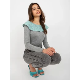 Dámska mätovo sivá blúzka s dlhými rukávmi a čipkou.