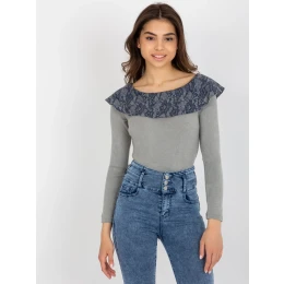 Šedomodrá blúzka s lodičkovým výstrihom a šnurovacím golierom.