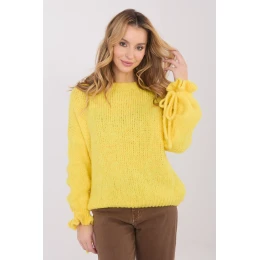 Dámsky sveter s ležérnym charakterom, ideálny na každodenné štylizácie a do práce. Model so štandardnou dĺžkou je vyrobený z mäkkej a príjemnej zmesi akrylu, polyamidu, viskózy a vlny, ktorá zaručuje pohodlie a teplo. Hladký vzor dodáva svetru univerzálny vzhľad, vďaka čomu ho možno ľahko kombinovať s rôznymi kúskami šatníka. Klasický okrúhly výstrih a dlhé rukávy podčiarkujú nadčasový strih. Ozdobné volániky s mašľami na rukávoch dodávajú celku ženský šarm a jemnú originalitu. Sveter nemá zapínanie, čo zaručuje pohodlie a voľnosť pri nosení.