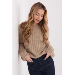 Dámsky sveter s ležérnym charakterom, vyrobený z materiálu s hrubou pleteninou, ktorý je ideálny na chladné dni. Ideálny model na každodenné nosenie a do práce, ktorý spája pohodlie s klasickým štýlom. Hladký vzor mu dodáva univerzálny vzhľad a pruhovaná štruktúra materiálu zdôrazňuje jeho módny charakter. Sveter je vyrobený z vysokokvalitnej zmesi polyakrylu, polyamidu, viskózy a vlny, ktorá poskytuje teplo, mäkkosť a pohodlie pri nosení. Štandardná dĺžka, okrúhly výstrih a absencia zapínania vytvárajú nadčasový strih. Dlhé nadýchané rukávy dodávajú celému kúsku ženský šarm a originalitu, vďaka čomu sa sveter stane štýlovým prvkom každodenného oblečenia.