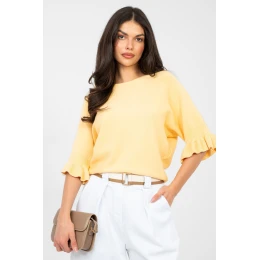 Elegantný dámsky sveter štandardnej dĺžky, ktorý je ideálny na každodenné nosenie aj na výnimočné príležitosti. Je vyrobený z vysokokvalitnej zmesi viskózy, polyesteru a nylonu, čo zaručuje pohodlie a odolnosť. Hladký vzor mu dodáva nadčasový charakter, zatiaľ čo jemné detaily mu dodávajú ženský šarm. Model má okrúhly výstrih a 3/4 rukávy ukončené jemným volánom, ktorý zdôrazňuje eleganciu a ľahkosť strihu. Skvelá voľba pre ženy, ktoré oceňujú klasiku v modernom prevedení.