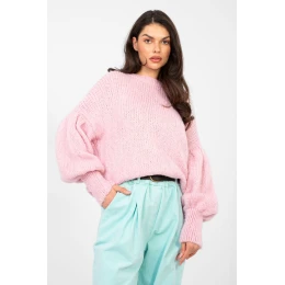 Elegantný dámsky sveter s ležérnym charakterom, ktorý je vhodný na každodenné nosenie aj do práce. Model so štandardnou dĺžkou bez zapínania poskytuje pohodlie a voľnosť pohybu, pričom sa dokonale hodí k štýlu každodenného oblečenia. Sveter je vyrobený z mäkkej a príjemnej zmesi akrylu, polyamidu, viskózy a vlny, čo zaručuje tepelný komfort a odolnosť materiálu. Dominantný vzor dodáva svetru módny vzhľad, zatiaľ čo hladké prvky vyvažujú celkový dojem a vytvárajú elegantný efekt. Balónové rukávy dodávajú svetru charakter a ženský šarm, vďaka čomu je efektným a zároveň univerzálnym kúskom oblečenia na mnohé príležitosti.