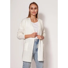 Mäkký svetrový kabát z melanžového úpletu. Vyrobený v poľskej rodinnej dielni. Minimalistický strih s tenkým rebrovaním, spadnutými ramenami a bočnými vreckami.