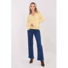 Elegantní dámský svetr ve stylu boho, ideální pro každodenní outfit. Model se vyznačuje efektním vzorem, který dodává lehkost, jemnost a módní, umělecký charakter. Svetr je vyrobený z kombinace polyesteru a viskózy, díky čemuž je měkký, příjemný na dotek a pohodlný na nošení. Standardní délka z něj činí univerzální střih, který lze snadno kombinovat s různými kousky oblečení. Dlouhé zvonové rukávy zdůrazňují boho atmosféru a dodávají celkovému vzhledu volnou eleganci. Model má výstřih do tvaru srdce, který opticky zúží postavu, a knoflíkové zapínání, které umožňuje nosit svetr jak rozepnutý, tak zapnutý. Skvělá volba pro ženy, které ocení pohodlí, přirozený styl a originální detaily ve svém každodenním outfitu.