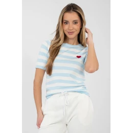 Elegantní pruhovaný dámský svetr je ideální volbou pro ženy, které ocení pohodlí a módní, ležérní styl. Klasický pruhový vzor mu dodává nadčasový charakter a skvěle zapadá do každodenních outfitů. Model s standardní délkou se skvěle přizpůsobuje postavě, a krátký rukáv zajišťuje pohodlí, zejména v teplejších dnech nebo jako součást vrstvených kombinací. Kulatý výstřih zdůrazňuje univerzální charakter svetru a dělá ho vhodným jak k džínům, tak k sukním nebo elegantním kalhotám. Svetr je vyroben z vysoce kvalitní směsi viskózy a polyesteru, díky čemuž je materiál měkký, příjemný na dotek a odolný proti vráskám. Půvabným akcentem je vyšité srdíčko na úrovni hrudníku vlevo, které celému outfitu dodává jemný, ženský charakter. Jedná se o skvělou volbu na každý den do práce, na setkání s přáteli nebo pro procházku.