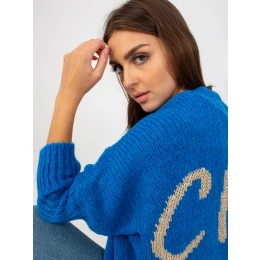 Tmavomodrý dámsky sveter s nápisom OCH BELLA na zadnej strane.