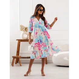 Svetlomodré a ružové dámske šaty so skladaným obálkovým výstrihom (704)