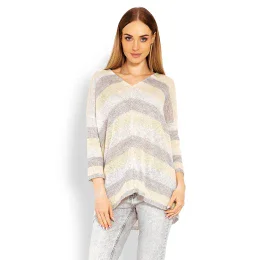 Voľný oversize strih. Sveter s trojfarebnými pruhmi. Špicatý výstrih. Výstrih do V na chrbte.